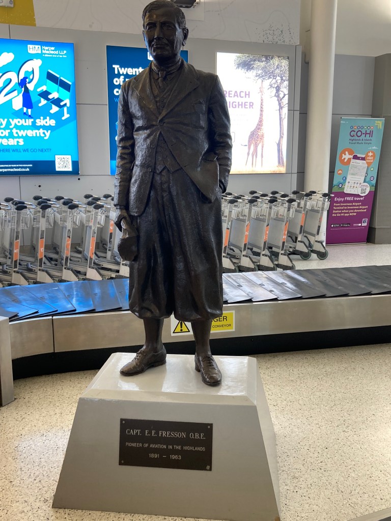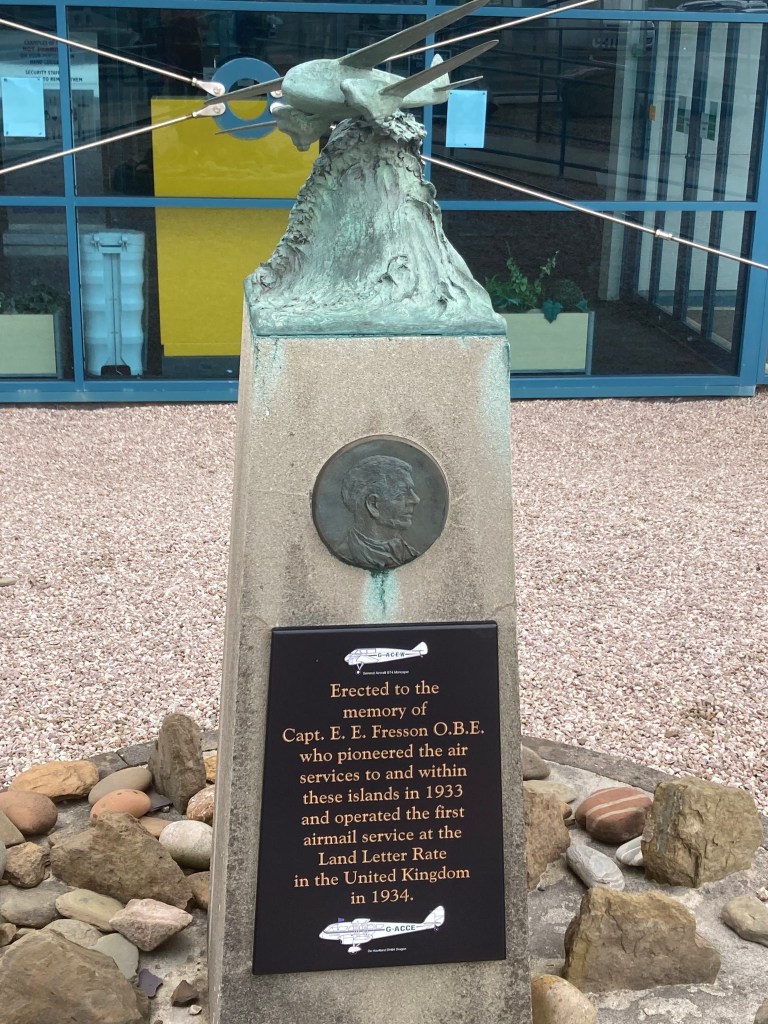 Da reise ich also an einem Sonntag gen Norden, und begegne auf zwei von vier Flughäfen, die ich durchschreite, einem Mann, dem gleich zwei Denkmäler gewidmet sind, E.E. (Ernest Edmont) Fresson. In nordschottischen Inverness steht er etwas verloren im Oval der Gepäckausgabe, auf den Orkney-Inseln in Wind und Wetter. Er war von Geburt an, also ab 1891, und dann auch in der Armee, an Flugzeugen interessiert und lernte sie fliegen. In der Zwischenkriegszeit gründete er eine Flugfirma, die dann in Cobham’s Flying Circus (sounds familiar, doesn’t it?) aufging (und ja, die tourten durch Grossbritannien und machten Zirkus, einfach ohne Tiere, dafür mit allerlei Flugzeugen). Dann gründete er eine zweite Flugfirma und für diese erhielt er die erste Konzesssion für Luftpost und lieferte offenbar pünktlich Briefe, Pakete auf den Orkney-Inseln ab. Im zweiten Weltkrieg liess er als Militär die erste geteerte Piste von Grossbritannien bauen und wodeliwo war die? Genau. Hier in Orkney. Und wäre ich, statt in Kirkwall aus meinem Flugzeug auszusteigen, noch einen Flughafen weitergeflogen, wäre dieses eine halbe Stunde später auf den Shetland-Inseln gelandet, und dort hätte ich das dritte Denkmal für E.E. fotografieren können.