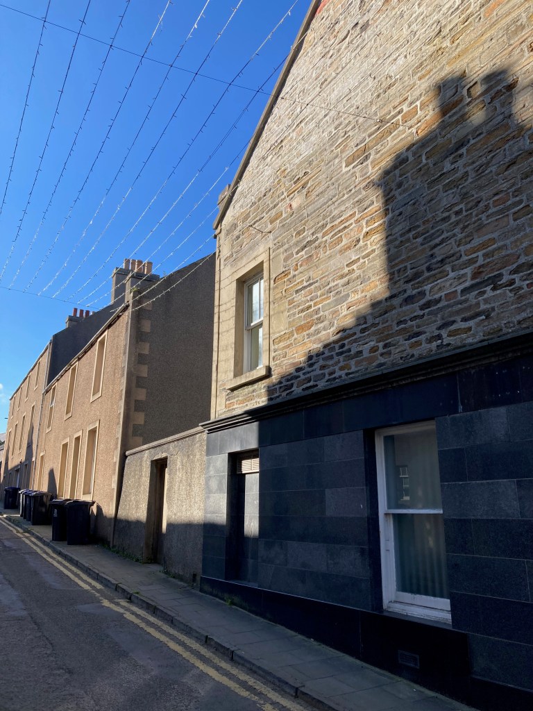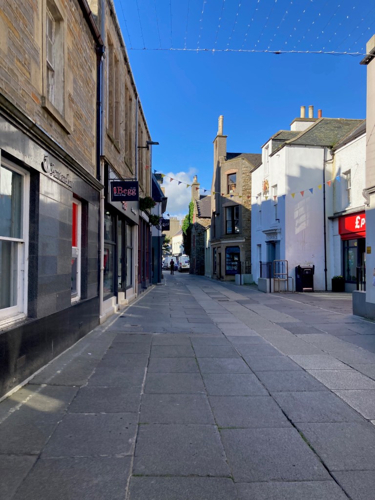 Dann einmal links in die Hauptstrasse von Kirkwall einbiegen. Der Begg ischimfall kein Begg, sondern ein Schuhladen. Und einen solch blauen Himmel haben sie hier seit Wochen nicht mehr gesehen. Und ja, die Strassen sind dann noch fast leer.