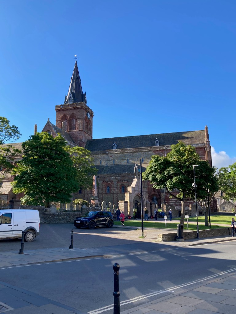 Und es war sogar gutes Wetter, sodass ich danach noch zu Fuss zu den Lieblingssteinen dort in der Nähe wanderte, mit dem Bus nach Stromness (dem zweiten Städtli hier) und dann zurück nach Kirkwall zum Einkaufen fuhr. Dort sind praktischerweise und alle ökonomische Logik bestätigend drei Supermärkte getrennt durch ihre Parkplätze unmittelbar nebeneinander gelegen.