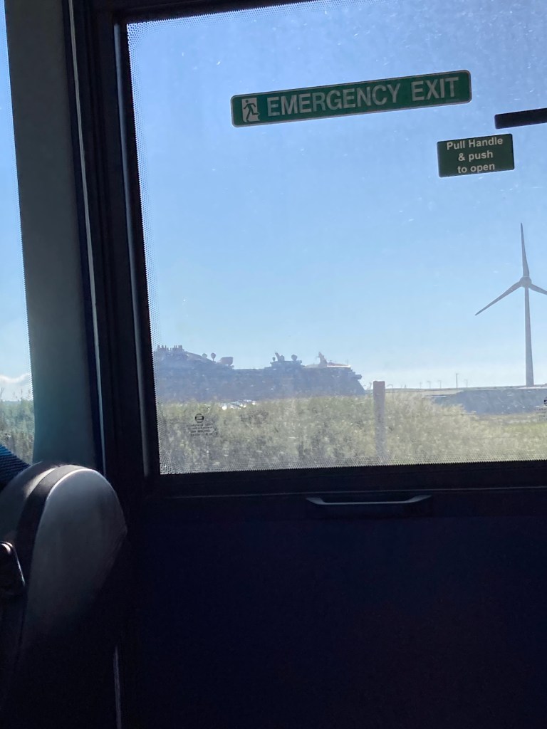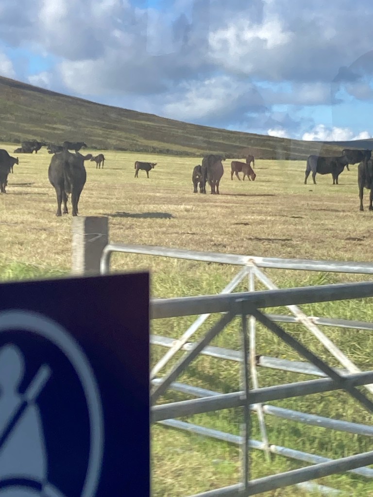 Und dann geht es vorbei an den ökonomischen Grundlagen des Lebens hier (von links nach rechts in der Rangfolge der Bedeutung): Tourismus (hier in Form eines 2000 Personen-Kreuzfahrtsschiffs, das heute in der früh die wohlhabenden Aelteren aus Kalifornien ausgespuckt hat), dann Energie (Wind und Wellen), Rinder und Kühe und Schafe. Wie ich die Subventionen fotografieren sollte, fiel mir nicht grad ein.